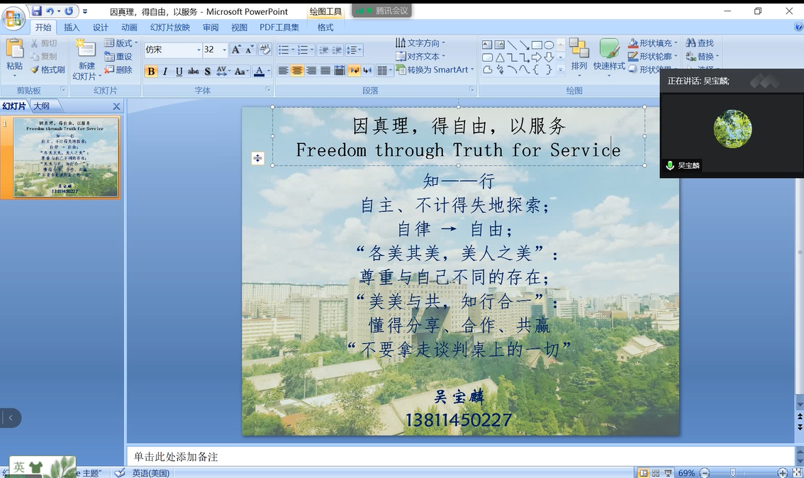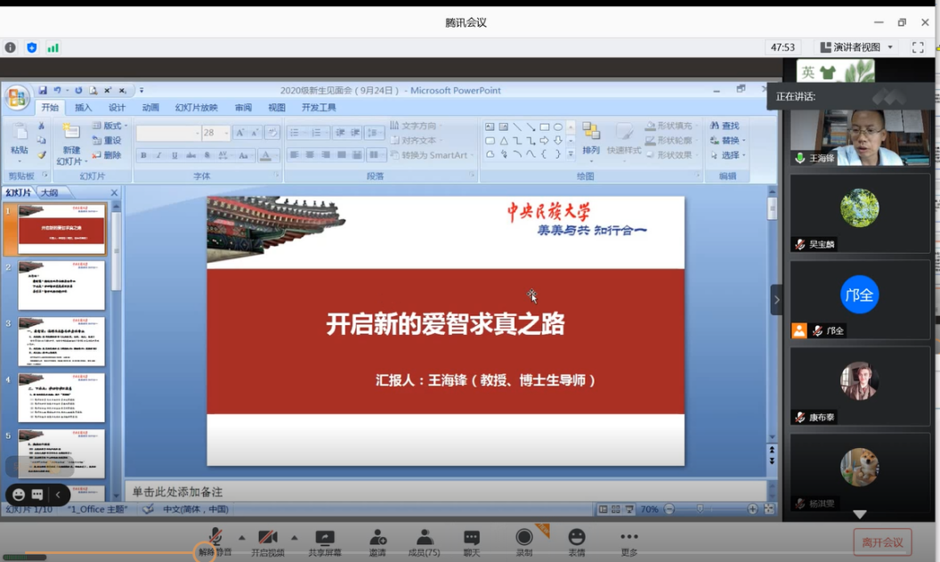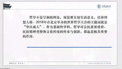 本院中国哲学教师、20级本科新生2班班主任兼辅导员吴宝麟老师也从自己的读书和认识经验,分享了燕京大学曾经的校训“因真理,得自由,以服务”和民族大学的校训,从学习心得、由知到行、如何在大中自主探索、如何在多元文化的环境中学习与人合作和相互欣赏之道,鼓励同学们将所学投入到帮助人群和服务社会中去。