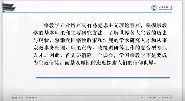 进而,宗教学教研室主任、20级本科新生1班班主任兼辅导员邝全老师与同学们分享了宗教学研究的意义和深度心得。她认为时代需要客观系统的宗教学研究。不管在西方哲学思想的历程,还是西方之外的文明,宗教的影响都是深入人内心世界和道德实践的。宗教现象融入在历史上人类心灵的常态之中。宗教的思想内涵、信仰体系和实践方式,是认识人最深情感和本能的入口。哲学史注重用理性探究追寻终极,而宗教学的研究对象往往是用整个生命活在终极意义之中。宗教学研究是这个世界上一项稀缺而有意义的探究。