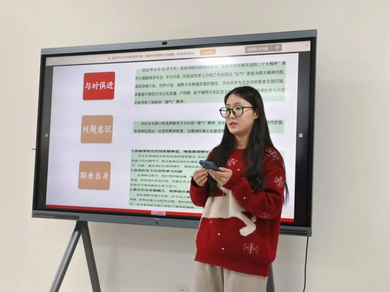 接下来,暑期优秀社会实践团队代表卢若昕同学分享了实践心得与经验。她从主题选择、团队分工、成果展示、心得感受四个方面与同学们进行了交流与分享。她鼓励同学们要紧跟时代步伐,选择与自己紧密相关的实践主题,并强调明确团队分工的重要性,以期呈现出多样化、贴近实际的实践报告。